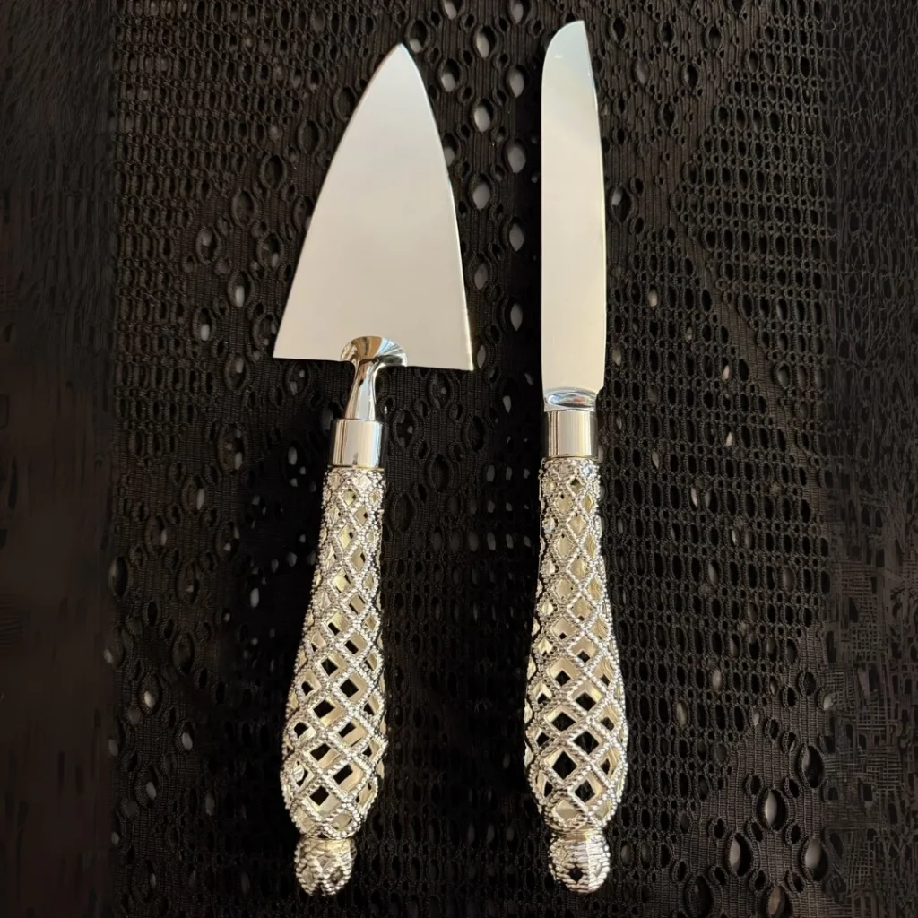 Gösterişli ve zarif sofraların vazgeçilmezi! Bu 2 parçalık pasta servis seti, ihtişamlı sap detayları ve parlak yüzeyiyle özel günlerde şıklığı tamamlıyor. Altın ve gümüş olmak üzere iki farklı renk seçeneğiyle sunulan bu set, düğün, nişan, doğum günü ve davet sofraları için idealdir.