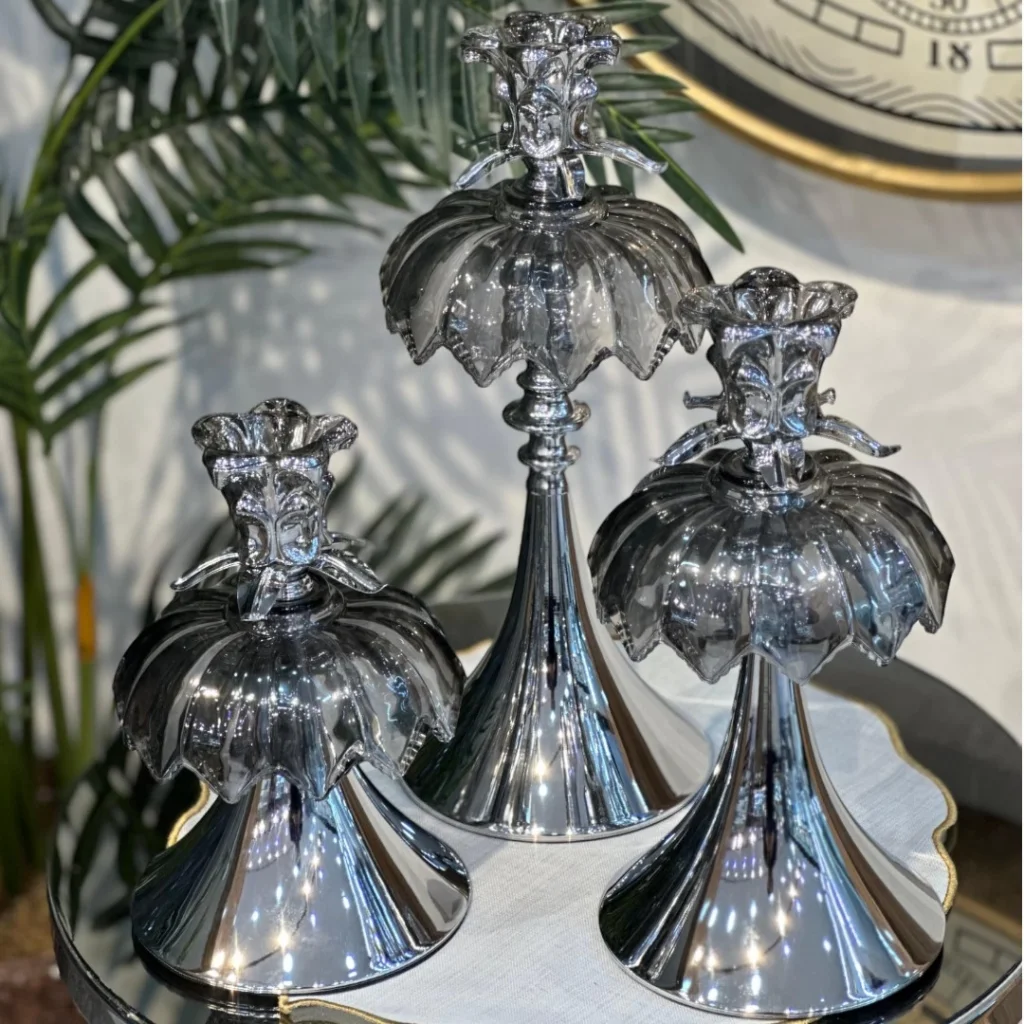 Modern dekorasyonun vazgeçilmezi gri tonları, bu özel tasarım mumluk setiyle buluşuyor. Çiçek formundaki üst kısmı cam işçiliğiyle öne çıkan bu 3’lü gri ayaklı cam mumluk seti; salonlardan yatak odalarına kadar her alana zarafet katmak için ideal. Göz alıcı parlaklığı ve asil duruşuyla hem dekoratif hem fonksiyonel bir üründür.