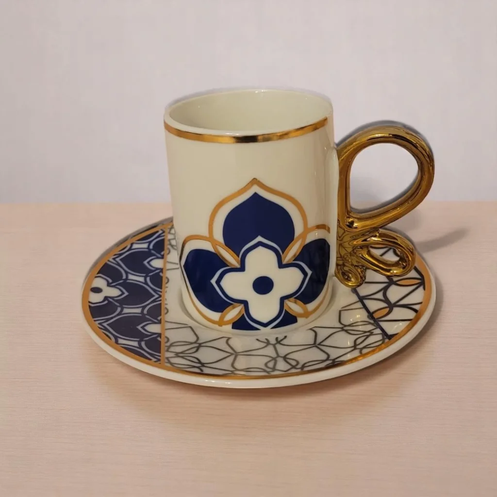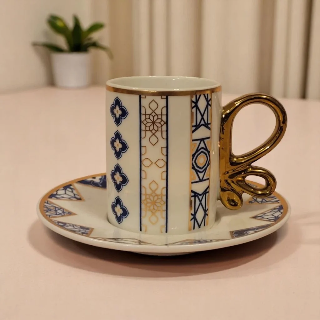 Altın yaldız işlemeleri ve zarif desenleriyle dikkat çeken bu porselen fincan takımı, kahve sunumlarınıza estetik bir dokunuş katıyor. Klasik Türk kahvesi ölçüsüne uygun tasarımıyla hem günlük kullanıma hem de özel davet sofralarına şıklık kazandırır.