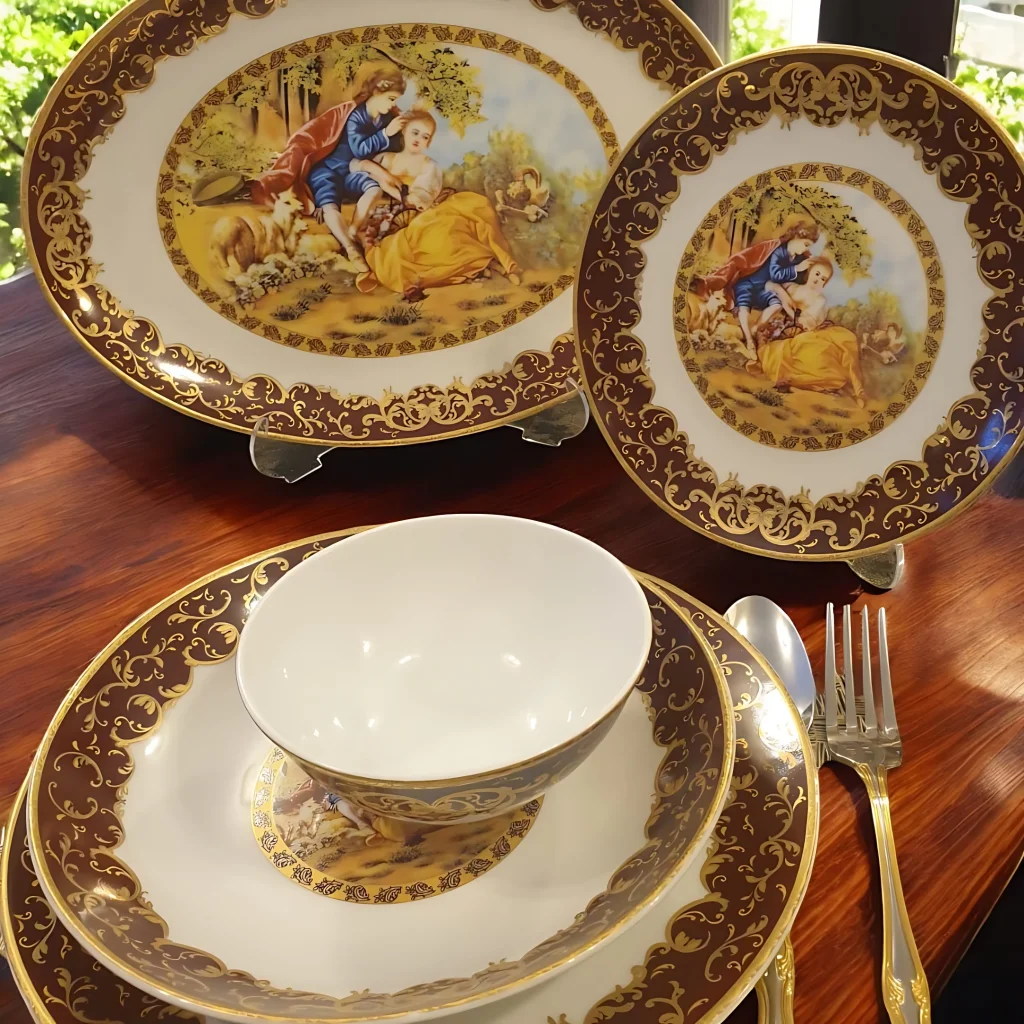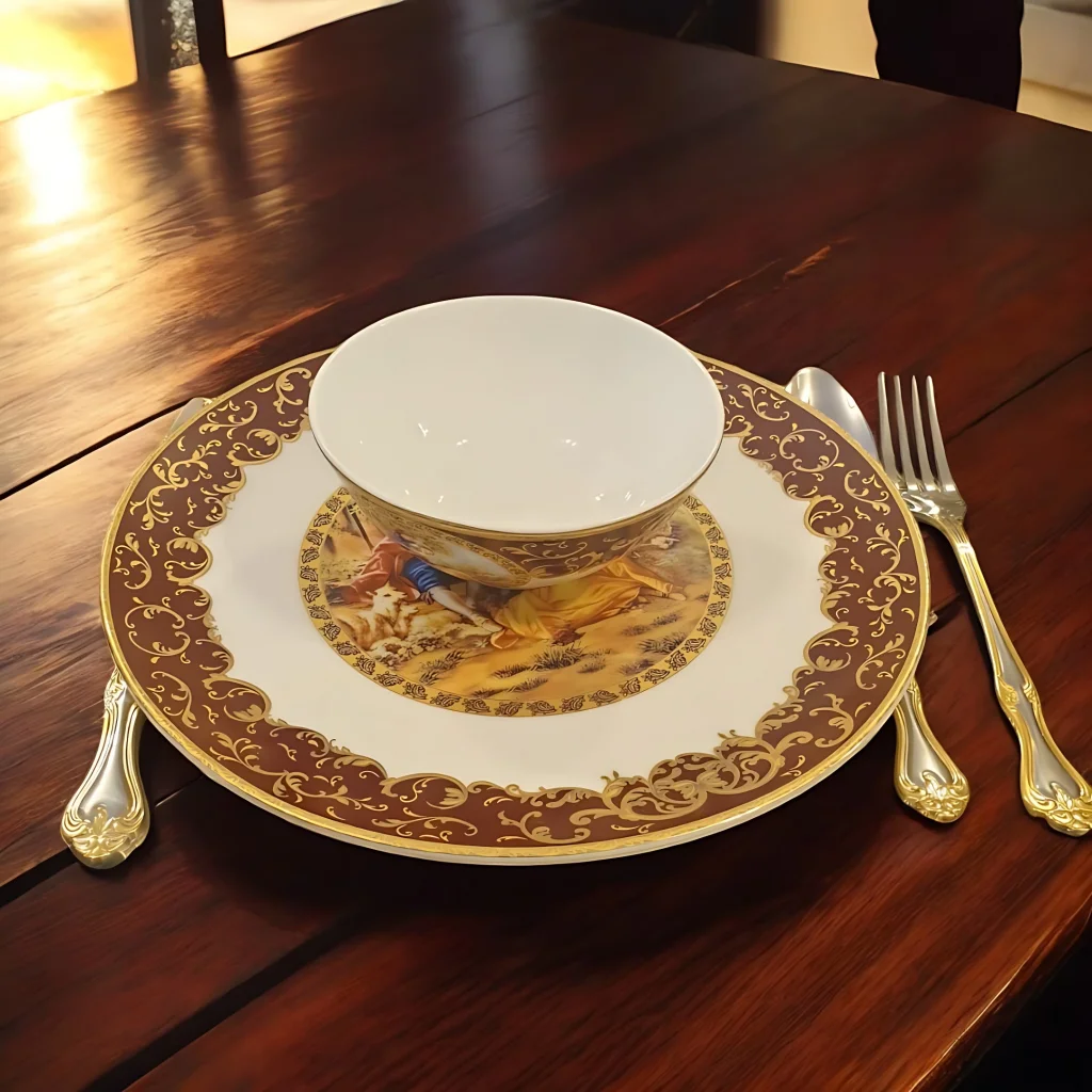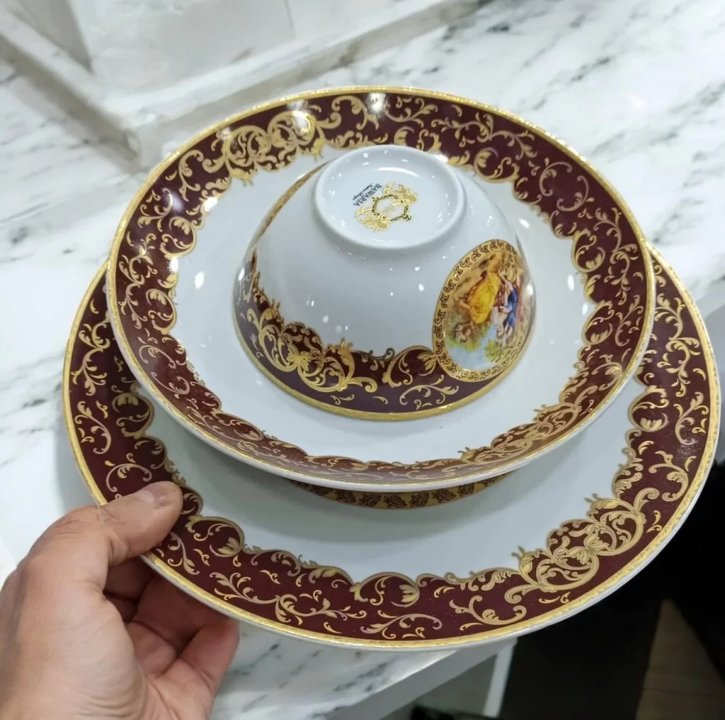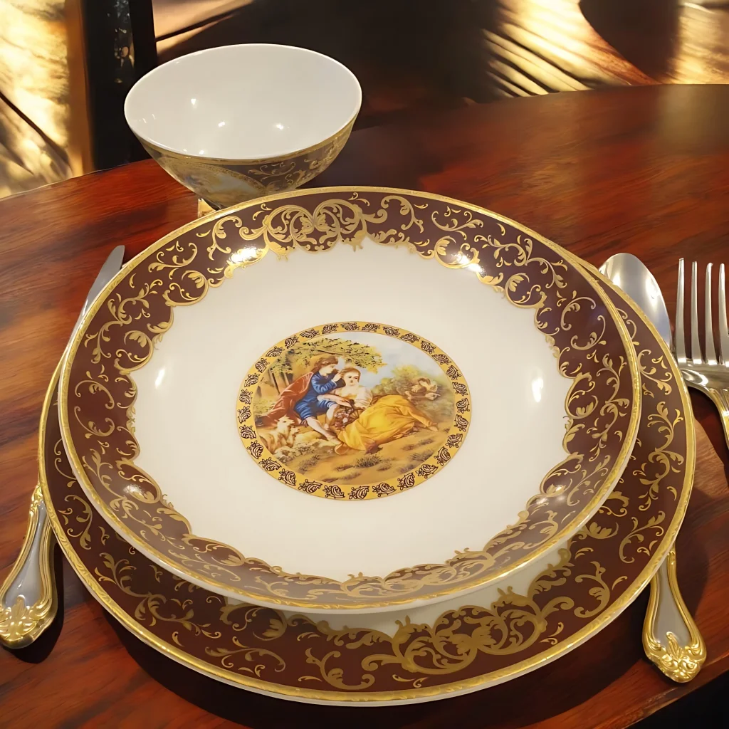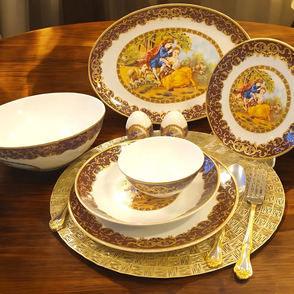 BAWARIA'nın zarafetini yansıtan bu 52 parçalık yemek takımı, Rokoko tarzı altın yaldız işlemeleri ve romantik figürlü tasarımıyla dikkat çekiyor. Barok desenleri ve göz alıcı altın detayları, klasik sanatın ihtişamını sofralarınıza taşıyor. Sanatsal sahnelerle süslenmiş tabaklar ve kaseler, özel davetlerde misafirlerinizi büyülemek için ideal. Yüksek kaliteli porselen malzemeden üretilen bu takım, uzun ömürlü kullanım sağlarken şıklığı da garanti ediyor. Sofranızda zarafeti ve nostaljiyi bir arada yaşamak isteyenler için mükemmel bir tercih!