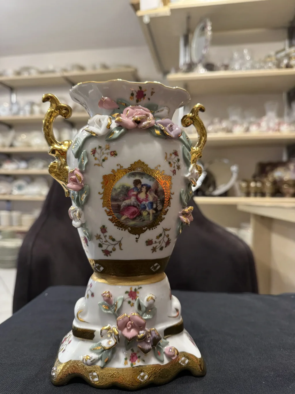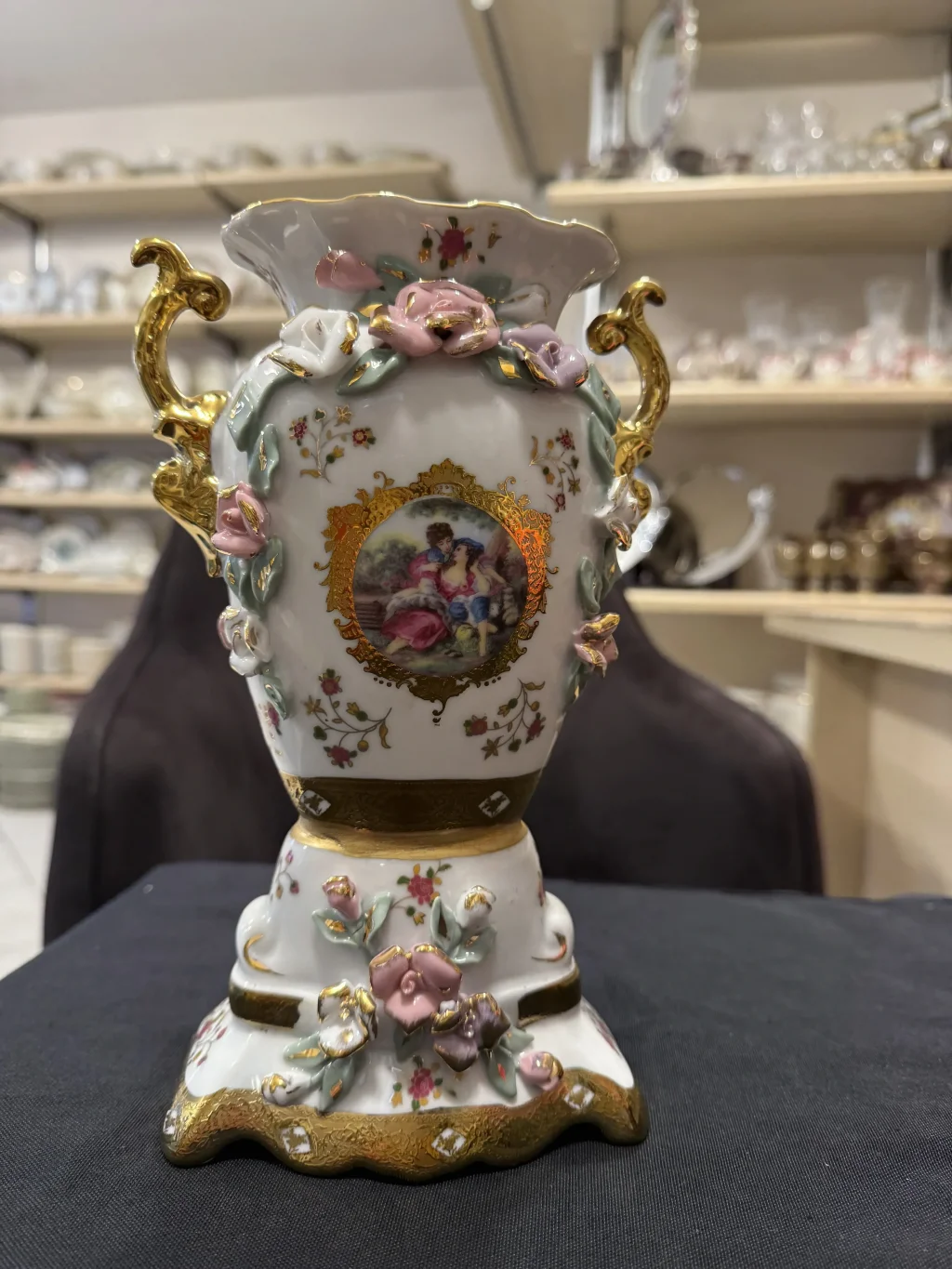 Limoge Çiçek Desenli Altın Kulplu Porselen Sunum Tabağı – 45×38 cm (Ayaklı, Oval/Yuvarlak)