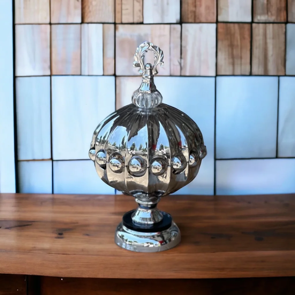 Geleneksel dokunuşu modern şıklıkla buluşturan bu gümüş detaylı cam şekerlik, hem zarif görünümü hem de fonksiyonel yapısıyla dikkat çekiyor. Parlak yansımaları, zarif kulp tasarımı ve klasik formuyla çay saatlerinizi ve ikramlarınızı daha özel hâle getirir. Dekoratif objeler arasında da öne çıkan bir parça olarak evinize şıklık katar.