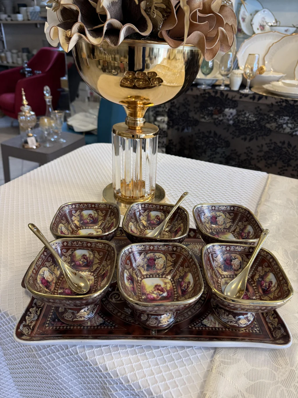 Takım; 6 adet porselen dondurmalık, zarif detaylara sahip kulplu porselen tepsi ve dondurmalıklar için özel tasarlanmış kaşıklarla eksiksiz bir sunum yapmanıza imkân tanır. Sadece ikramlarda değil, vitrin ve konsollarda dekoratif bir obje olarak da göz kamaştırır.