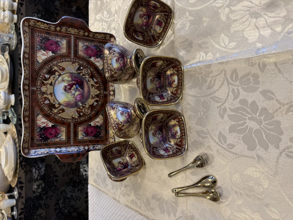 Avrupa porselen sanatının zarafetini yansıtan bu özel takım, hem şıklığı hem de işlevselliğiyle dikkat çeker. Setin parçaları, ince altın varak süslemeleriyle zenginleştirilmiş olup, gövdesinde romantik figürler ve gül desenleri yer almaktadır.
