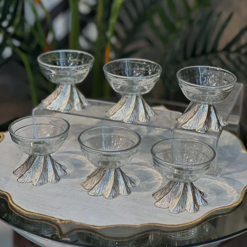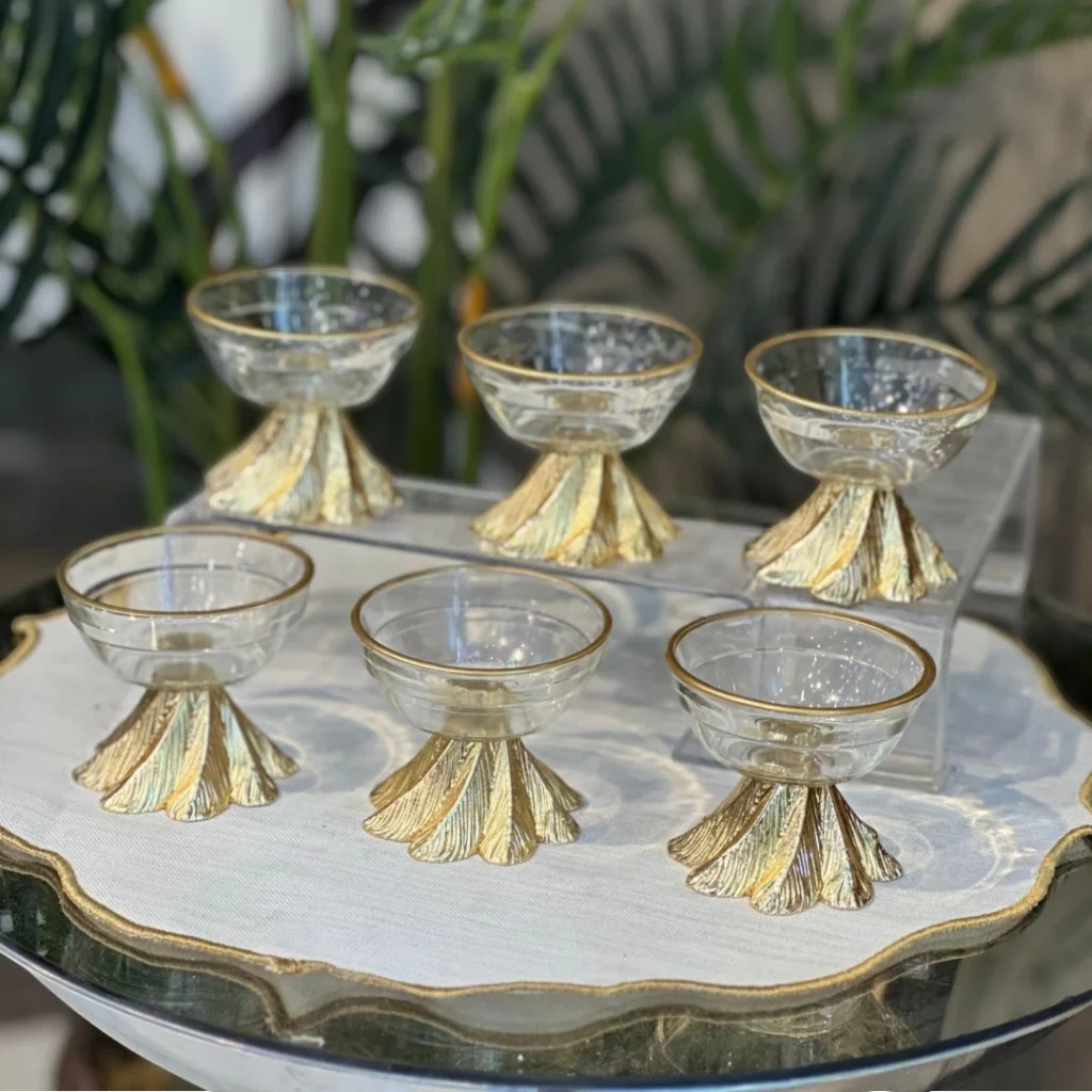 Kahve sunumlarınıza zarif bir dokunuş katmak için tasarlanmış bu 6’lı lokumluk seti, göz alıcı detaylarıyla sofralarınıza şıklık getiriyor. Alt kısmındaki yaprak desenli özel ayak tasarımı ve kristal berraklığındaki cam kaseleriyle, hem geleneksel hem de modern sunumlara uyum sağlar.
