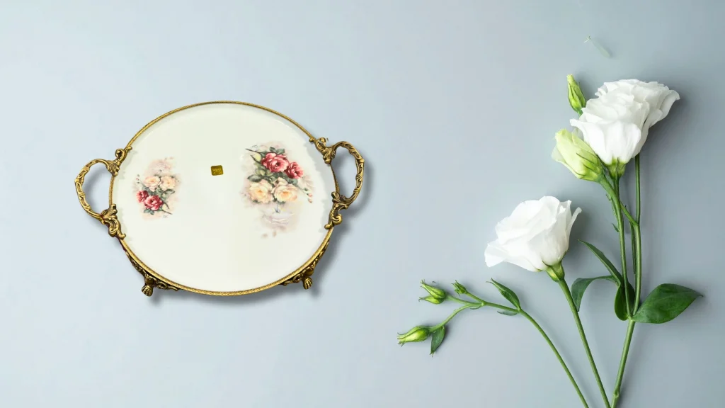 Krem zemin üzerinde çiçek buketi; dış çerçevede ince yiv & altın hat