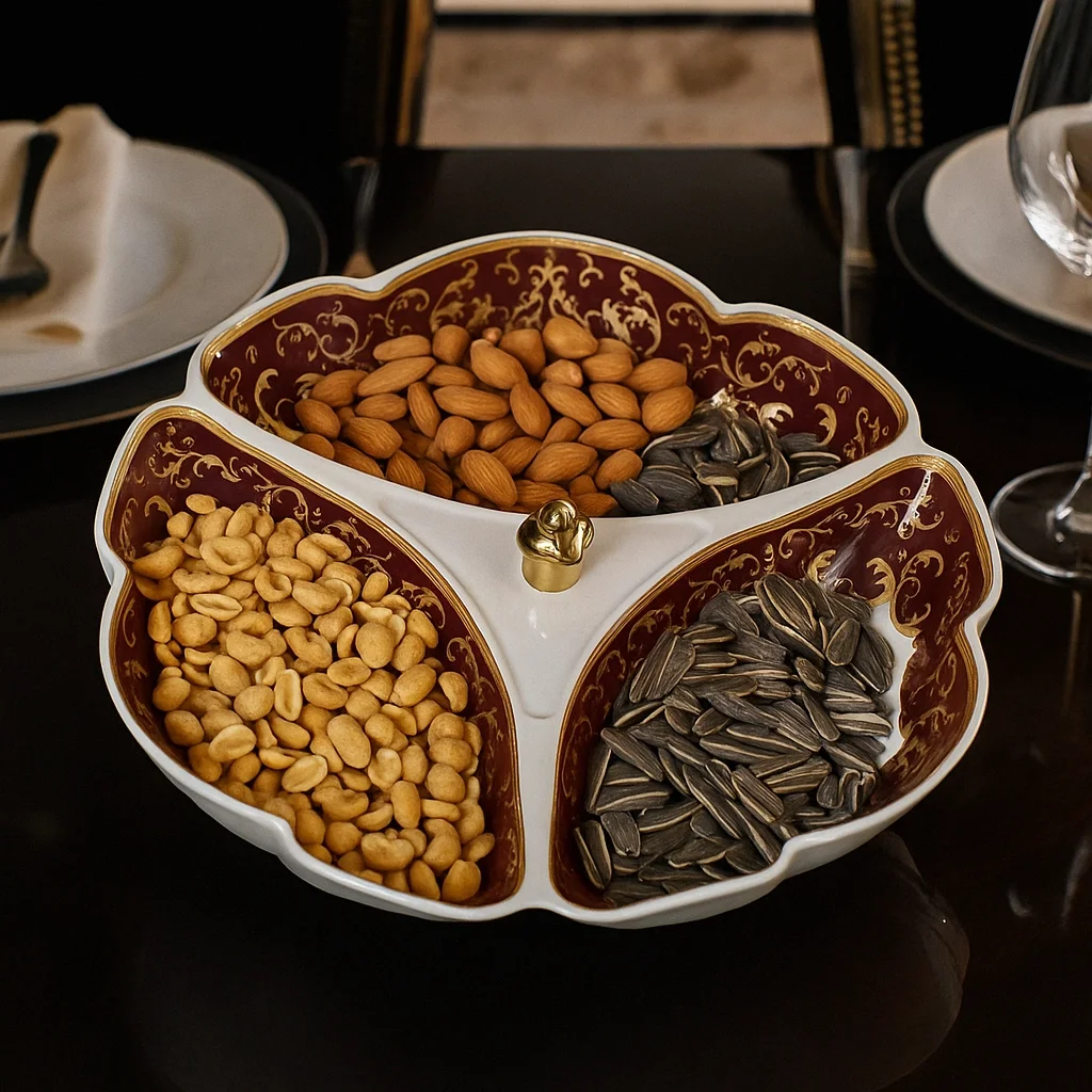 Şık tasarımı ve işlevsel yapısıyla dikkat çeken 3 bölmeli sunumluk, sofralarınıza zarafet katmak için tasarlandı. Farklı atıştırmalıkları, mezeleri veya çerezleri aynı tabakta servis etmenizi sağlayarak pratiklik sunar. Dayanıklı yapısı ve modern görünümüyle hem günlük kullanıma hem de özel davet sofralarına uygundur.